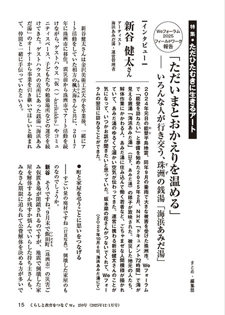 Weフォーラムを機に訪ねた珠洲の「海浜あみだ湯」では、新谷健太さんらが、解体した家屋の廃材を引き取り、家主の思いを聞き、記録しつつ、家や町を弔うように燃やしている。飄々と力仕事にいそしみ人々が集う銭湯を開き続ける営みの中から、アート作品を生み出す。お二人それぞれの姿勢に心をゆさぶられ、特集タイトルとしました。