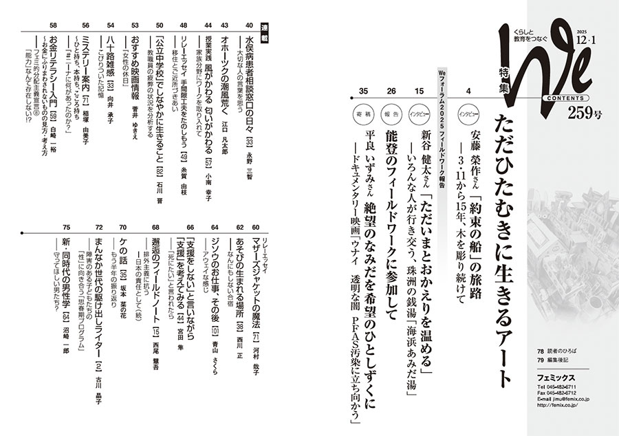 そのほか、能登のフィールドワークの報告、PFAS(有機フッ素化合物)汚染の問題に声を上げた女性たちを取材したドキュメンタリー映画「ウナイ 透明な闇 PFAS汚染に立ち向かう」について、平良いずみ監督から寄稿していただいた。