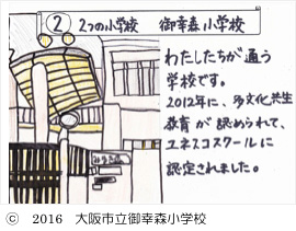 生野区北西部に東西にある御幸通商店街(大阪生野コリアタウン)のそばに御幸森小学校はあります。大阪市内では、公立小中学校約100校に朝鮮半島にルーツがある子どもたちを対象にした民族学級が設置されています。もっとも古い学校では、70年におよぶ歴史があり、御幸森小学校でも30年におよぶ民族学級(現在は「国際クラブ」)の取り組みがあります。2012年にユネスコスクールに認定されてからは、国際クラブの時間と並行して、すべての児童を対象に、より深化・充実した国際理解教育を行うために「ユネスコタイム」を開設し、世界の国々の様子や文化などを学んだり、民族学級と連携した活動を行っています。