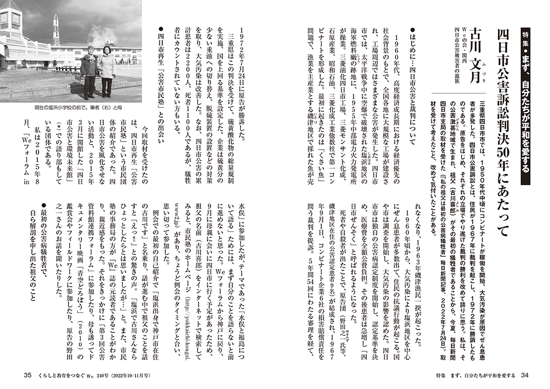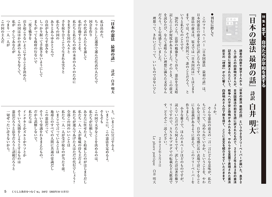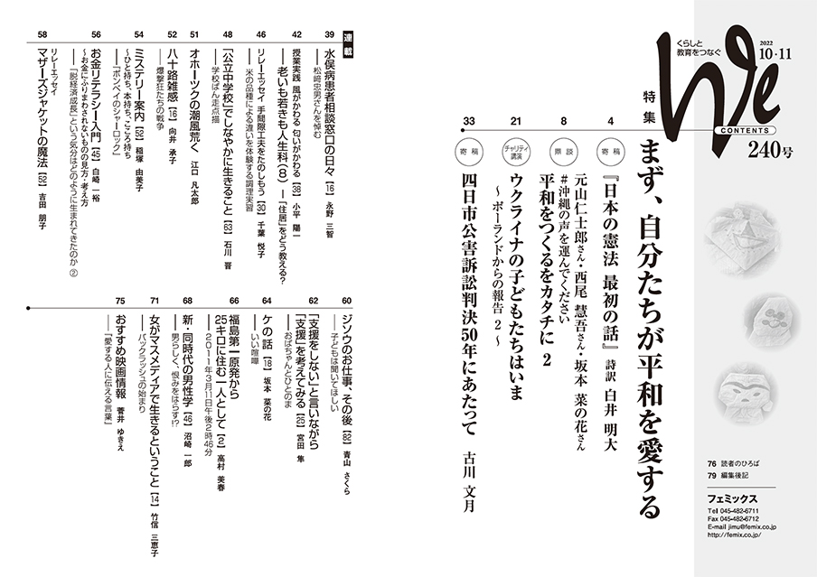 特集は4本。白井明大さんの憲法前文の詩訳『日本の憲法 最初の話』。沖縄のことを伝え続ける3人の若者、元山仁士郎さん、西尾慧吾さん、坂本菜の花さんの鼎談。前号に続き、ウクライナからポーランドに避難した人と支援者の今を伝える報告。Weフォーラム水俣をきっかけに四日市公害を学び直した古川文月さんの寄稿です。