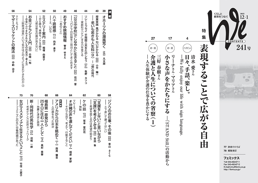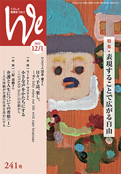 表紙の絵は、障がいのある方たちのつくるアート作品を見てもらえる機会をもっと増やしたい、とスペースナナで開催された「ココロはずむアート展」に出品された三好綾さん(アート屋わんど/横浜市緑区)の作品(一部)です。