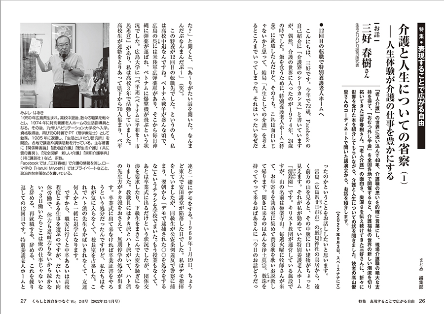 あわせて、「老人介護」の面白さ、奥深さを伝え続けてきた三好春樹さんのお話を紹介する。病気、挫折、コンプレックスといった人生体験が介護を豊かにするという話に励まされる。
