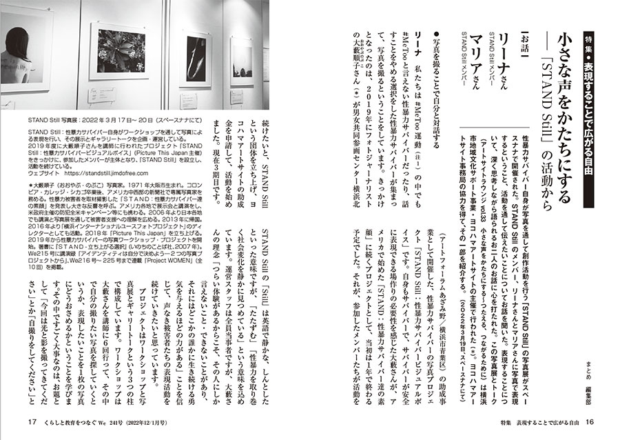 性暴力サバイバー自身が写真を通して創作活動する「STAND Still」のリーナさんとマリアさんに、写真で自分と対話すること、表現することで広がる自由についてお話を聞いた。