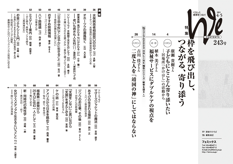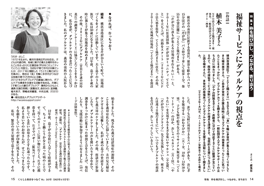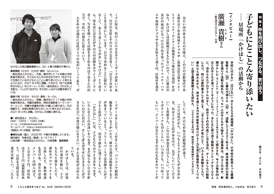 今号は居場所を拠点に活動するお二人に話を聞いた。生きづらさを抱えた子どもに寄り添おうと居場所をひらく「かけはし」の廣瀬貴樹さん。「○○すべき」がない場所で、自分でどう過ごすか決める。「一緒に居る、一緒に楽しむ」その繰り替えしを大切にする。多世代の居場所づくりと、ダブルケアの啓発・相談活動を続ける植木美子さん。どちらも既存の制度の中では対応が難しいと、枠を飛び出し、つながりの中で課題に向き合う。