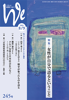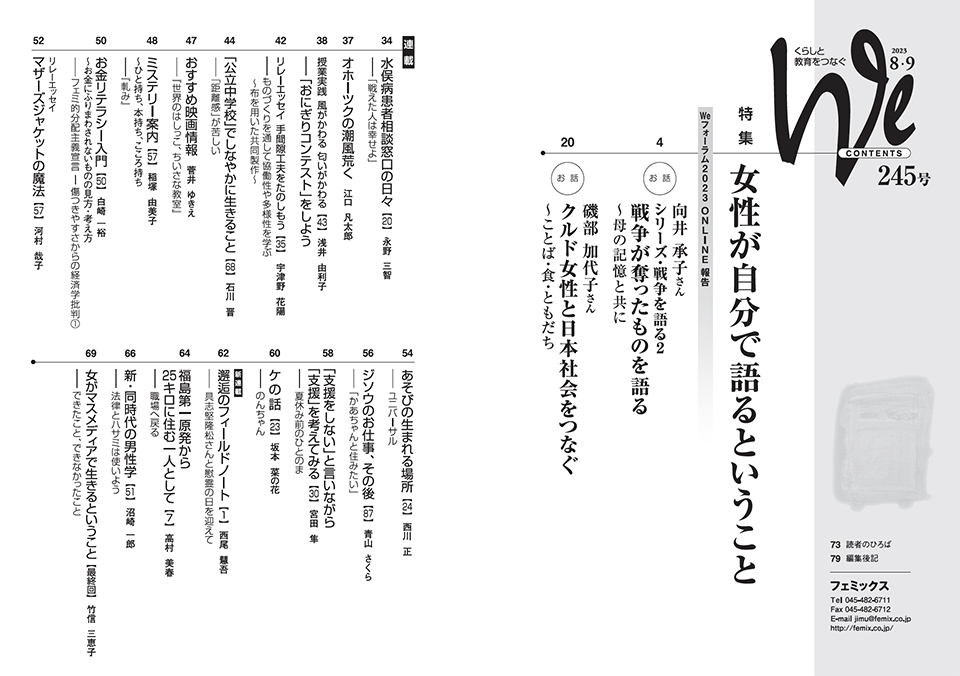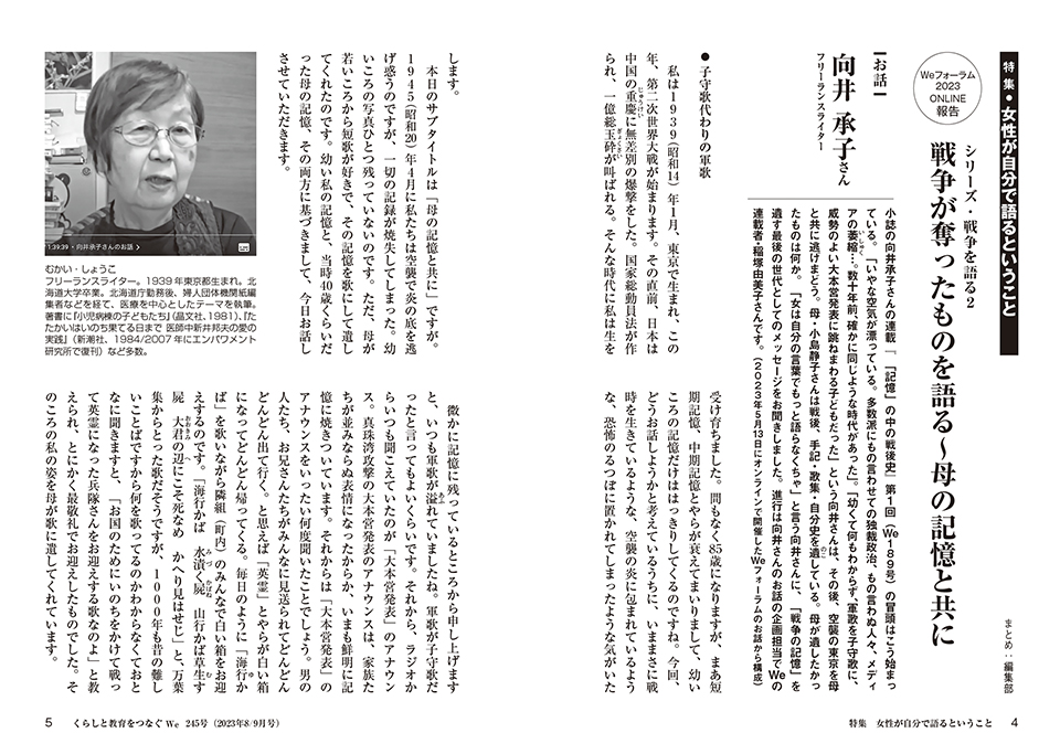 特集はWeフォーラムONLINEの報告を2本。1本目は空襲の中を逃げ惑う経験を持ち、戦後の民主主義教育第一世代である向井承子さんに、歌を遺されたお母様の記憶を重ねながら、戦争と人間についてお話いただきました。