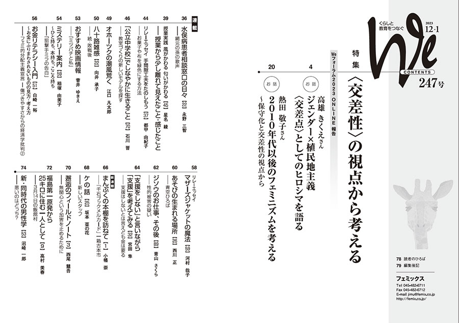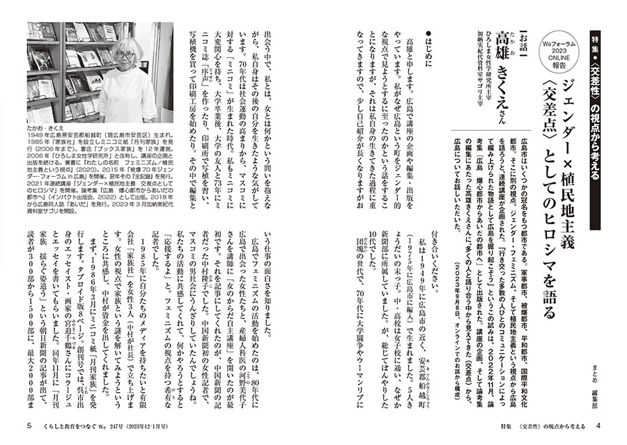 特集はWeフォーラムONLINEの高雄きくえさんと熱田敬子さんのお話。高雄さんの、広島の被害の「記憶の女性化」がもたらしたもの、フェミニズムや植民地主義という視点から見えてきたこと、というお話には多くの気づきがあった。