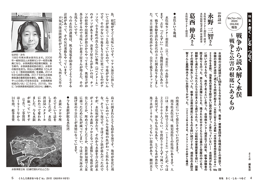 1本目は「戦争から読み解く水俣〜戦争と公害の根底にあるもの」と題して、戦争と公害の根底にあるものを問い続けてきた、水俣病センター相思社の永野三智さんと葛西伸夫さんにお話をうかがった。
