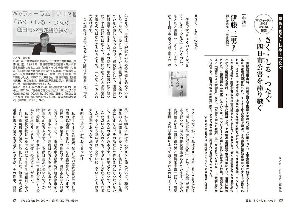 2本目は、四日市公害の問題に関わってこられた伊藤三男さん(四日市再生『公害市民塾』)に「きく・しる・つなぐ〜四日市公害を語り継ぐ」と題してお話をうかがった。