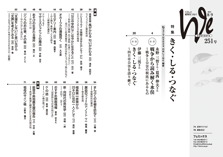 誰かが苦しんでいる時、泣いている時、声を上げた時、そばにいること。その理由を考え、ようやく上げた声に注目をし続けること。当事者の選択を尊重し、尊厳が守られるような環境を整えること。なかったことにしないために、語り続けること。その大切さに改めて気づき、特集タイトルを「きく・しる・つなぐ」としました。