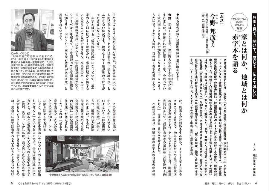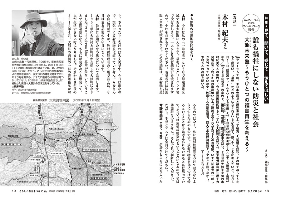 フィールドワーク(10月5〜6日)では浪江町、双葉町、南相馬市のほか、大熊未来塾の木村紀夫さんの案内で、今も帰還困難区域となっている大熊町を訪ねました。福島で何があったのかを知り、考えて、伝えていく。それが未来の防災や、国策のあやまちを繰り返さないためにも大切なのだと、お二人のお話から強く感じ、特集タイトルを「見て、聞いて、感じて 伝えてほしい」としました。