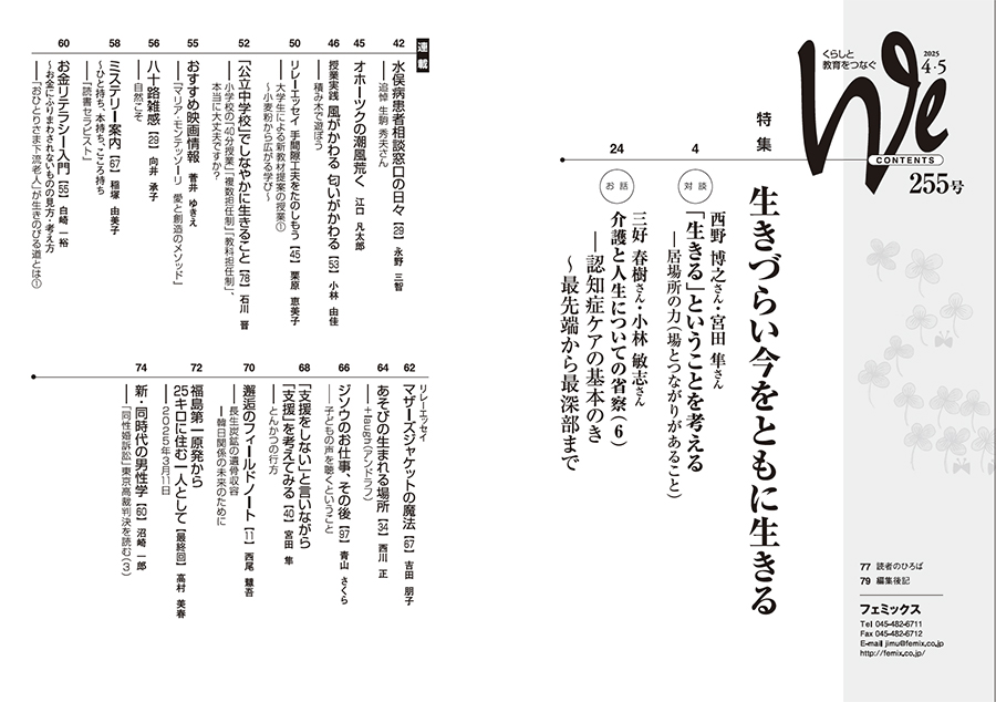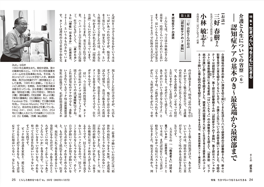 三好春樹さんと宅老所「はいこんちょ」の小林敏志さんの認知症ケアのお話も、困難な状況を抱える人にユーモアと現場の知恵で立ち向かう、人の尊厳と向き合うことの深淵を見るようで、特集タイトルを「生きづらい今をともに生きる」としました。
