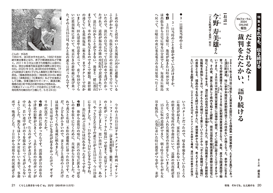 特集2本目は、福島のいまを伝え続ける、「子ども脱被ばく裁判」原告の今野寿美雄さんのお話「だまされるな!裁判をたたかい、語り続ける」。